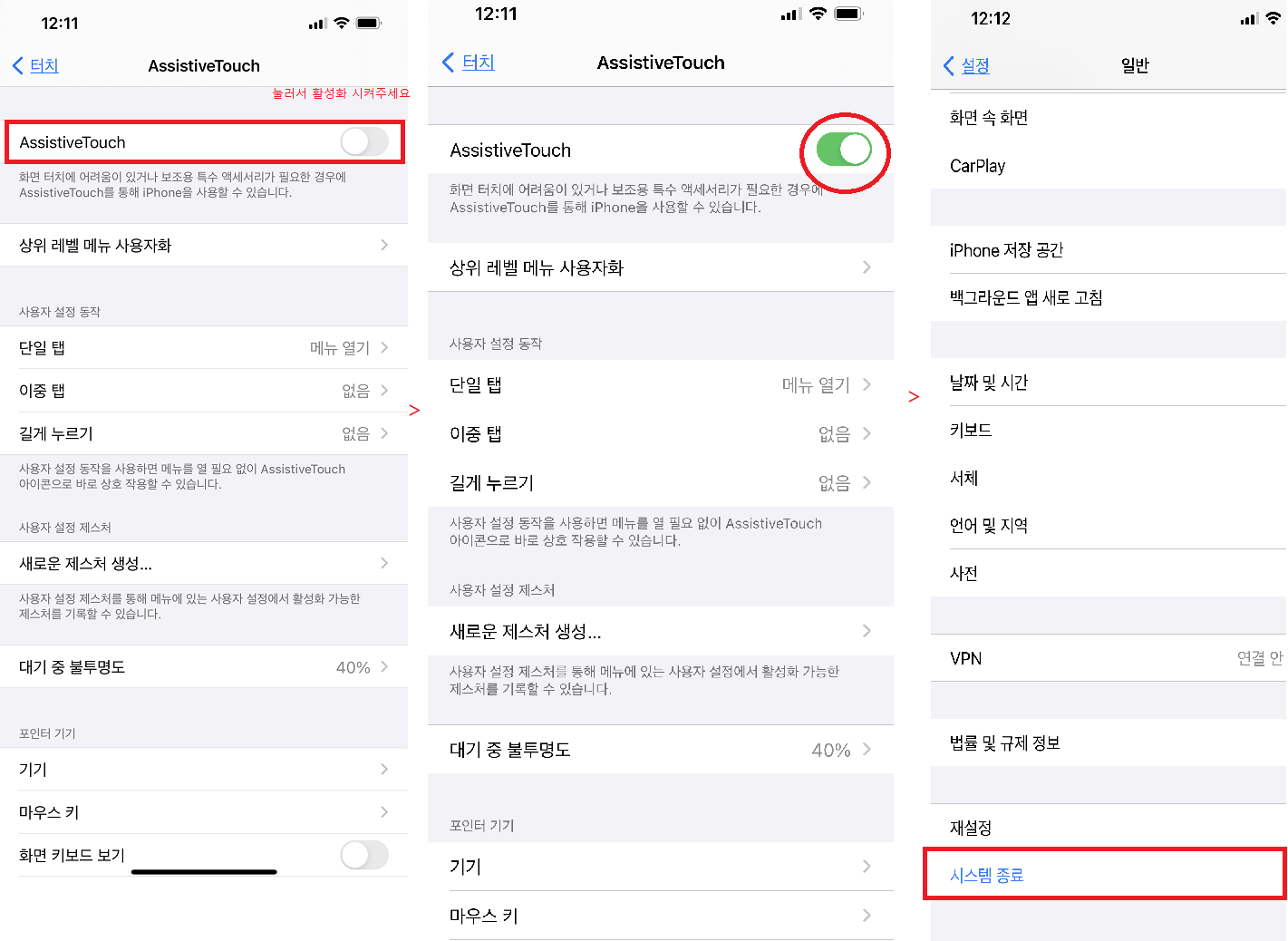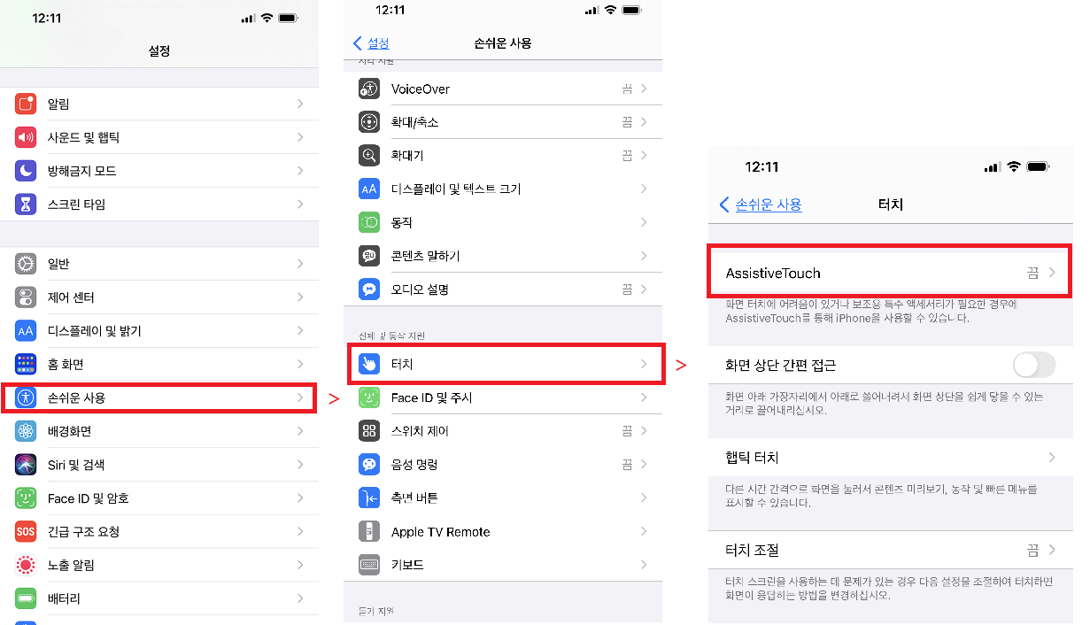 설정 -> 손쉬운 사용 -> 터치 -> AssistiveTouch -> Assistive Touch 활성화 (회색버튼 활성화) ->