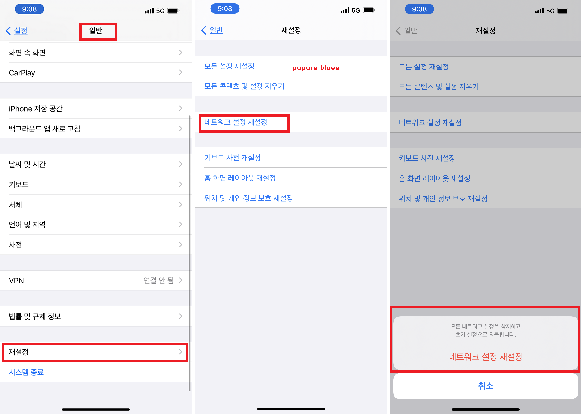 일반 - 재설정 - 네트워크 재설정